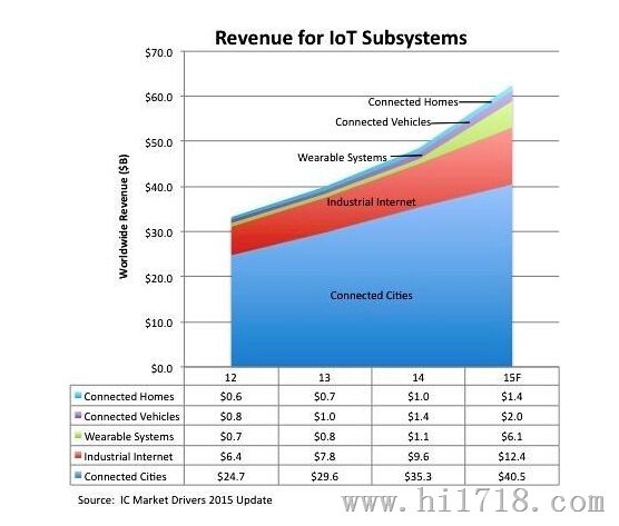 物聯(lián)網(wǎng)是新一代信息技術(shù)的重要組成部分,也是信息化時(shí)代的重要發(fā)展階段,被稱之為繼計(jì)算機(jī)、互聯(lián)網(wǎng)之后世界信息產(chǎn)業(yè)發(fā)展的第三次浪潮。IC Insights將物聯(lián)網(wǎng)市場(chǎng)分為連網(wǎng)汽車、連網(wǎng)家庭、工業(yè)因特網(wǎng)、連網(wǎng)城市以及可穿戴設(shè)備等五大應(yīng)用領(lǐng)域,該機(jī)構(gòu)認(rèn)為其中以可穿戴設(shè)備的成長(zhǎng)動(dòng)力最強(qiáng)勁。